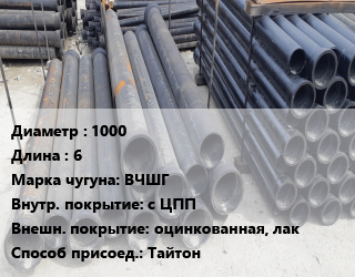Труба чугунная 1000 L=6 Чугун:ВЧШГ с ЦПП *оцинкованная, лак Тайтон