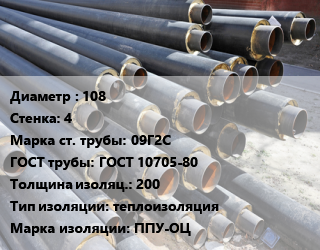 Труба предизолированная 108 s=4 Сталь: 09Г2С ГОСТ: ГОСТ 10705-80 s изоляции=200 теплоизоляция ППУ-ОЦ