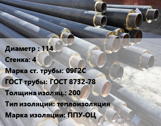 Труба предизолированная 114 s=4 Сталь: 09Г2С ГОСТ: ГОСТ 8732-78 s изоляции=200 теплоизоляция ППУ-ОЦ