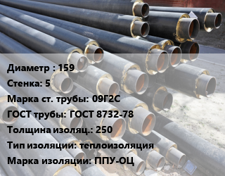 Труба предизолированная 159 s=5 Сталь: 09Г2С ГОСТ: ГОСТ 8732-78 s изоляции=250 теплоизоляция ППУ-ОЦ