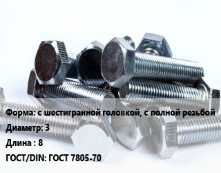 Болт с шестигранной головкой, с полной резьбой 3х8 ГОСТ 7805-70