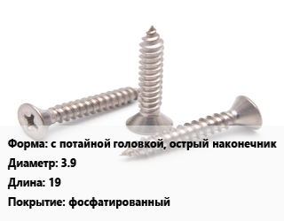 Саморез с потайной головкой, острый наконечник D=3.9 L=19 фосфатированный