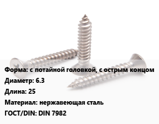 Саморез с потайной головкой, с острым концом D=6.3 L=25 нержавеющая сталь ГОСТ: DIN 7982