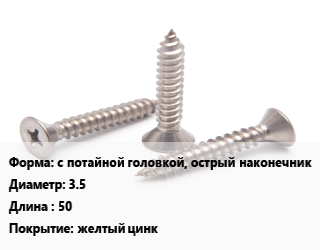 Саморез с потайной головкой, острый наконечник D=3.5 L=50 желтый цинк