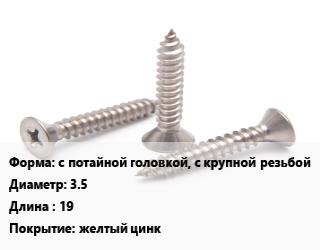 Саморез с потайной головкой, с крупной резьбой D=3.5 L=19 желтый цинк