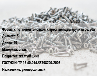 Шуруп с потайной головкой, с крест.шлицем,крупная резьба 5х45 сталь желтый цинк ГОСТ: ТУ 16 40-014-55798700-2006 универсальный
