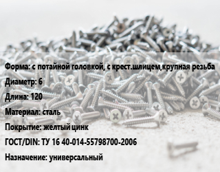 Шуруп с потайной головкой, с крест.шлицем,крупная резьба 6х120 сталь желтый цинк ГОСТ: ТУ 16 40-014-55798700-2006 универсальный