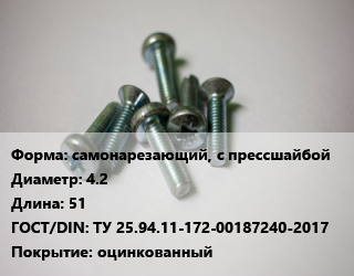 Винт самонарезающий, с прессшайбой 4.2х51 ТУ 25.94.11-172-00187240-2017 оцинкованный