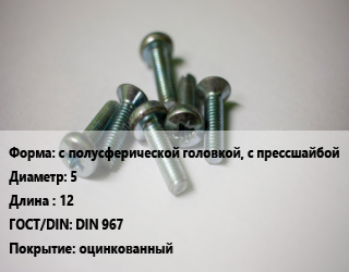 Винт с полусферической головкой, с прессшайбой 5х12 DIN 967 оцинкованный