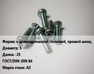 Винт с цилиндрической головкой, прямой шлиц 5х25 DIN 84 Сталь: A2, по запросу, кг цена от 3.68 сом / кг, где купить, условия доставки в Оше и Ошской области