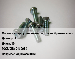 Винт с полукруглой головкой, крестообразный шлиц 6х10 DIN 7985 оцинкованный