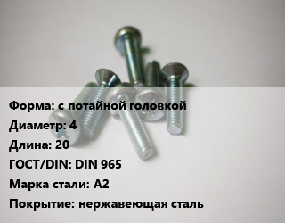 Винт с потайной головкой 4х20 DIN 965 Сталь: А2 нержавеющая сталь, цена за шт, кг цена от 3.87 сом / кг, где купить, условия доставки в Оше и Ошской области