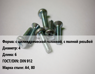 Винт с цилиндрической головкой, с полной резьбой 4х6 DIN 912 Сталь: A4, 80