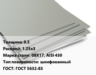 Лист нержавеющий 0.5 1.25х3 Сталь: 08Х17, AISI 430 Тип:шлифованный ГОСТ 5632-83