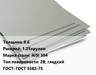 Лист нержавеющий 0.6 1.25хрулон Сталь: AISI 304 Тип:2B, гладкий ГОСТ 5582-75