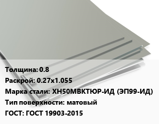 Лист нержавеющий 0.8 0.27х1.055 Сталь: ХН50МВКТЮР-ИД (ЭП99-ИД) Тип:матовый ГОСТ 19903-2015