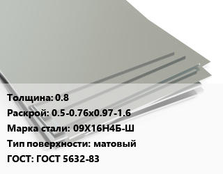 Лист нержавеющий 0.8 0.5-0.76х0.97-1.6 Сталь: 09Х16Н4Б-Ш Тип:матовый ГОСТ 5632-83