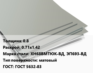 Лист нержавеющий 0.8 0.71х1.42 Сталь: ХН68ВМТЮК-ВД, ЭП693-ВД Тип:матовый ГОСТ 5632-83