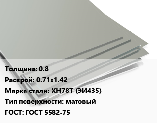 Лист нержавеющий 0.8 0.71х1.42 Сталь: ХН78Т (ЭИ435) Тип:матовый ГОСТ 5582-75