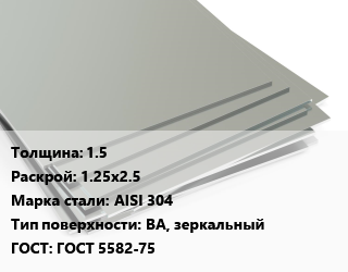 Лист нержавеющий 1.5 1.25х2.5 Сталь: AISI 304 Тип:BA, зеркальный ГОСТ 5582-75