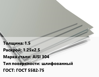 Лист нержавеющий 1.5 1.25х2.5 Сталь: AISI 304 Тип:шлифованный ГОСТ 5582-75