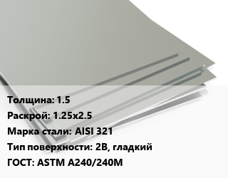 Лист нержавеющий 1.5 1.25х2.5 Сталь: AISI 321 Тип:2B, гладкий ASTM А240/240М