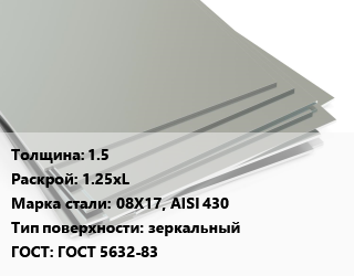 Лист нержавеющий 1.5 1.25хL Сталь: 08Х17, AISI 430 Тип:зеркальный ГОСТ 5632-83