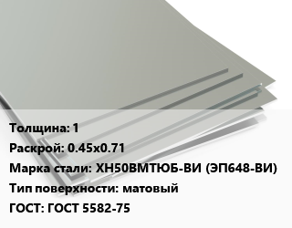 Лист нержавеющий 1 0.45х0.71 Сталь: ХН50ВМТЮБ-ВИ (ЭП648-ВИ) Тип:матовый ГОСТ 5582-75