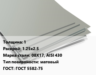 Лист нержавеющий 1 1.25х2.5 Сталь: 08Х17, AISI 430 Тип:матовый ГОСТ 5582-75