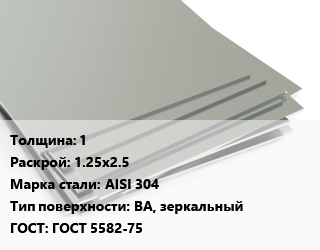 Лист нержавеющий 1 1.25х2.5 Сталь: AISI 304 Тип:BA, зеркальный ГОСТ 5582-75