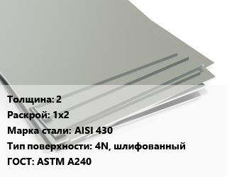 Лист нержавеющий 2 1х2 Сталь: AISI 430 Тип:4N, шлифованный ASTM A240