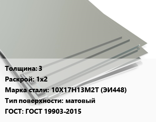 Лист нержавеющий 3 1х2 Сталь: 10Х17Н13М2Т (ЭИ448) Тип:матовый ГОСТ 19903-2015