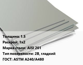Лист нержавеющий 1.5 1х2 Сталь: AISI 201 Тип:2B, гладкий ASTM A240/A480