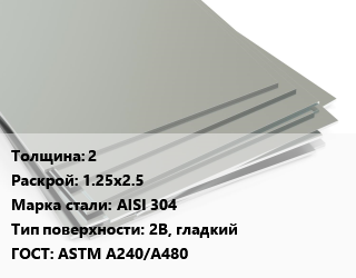 Лист нержавеющий 2 1.25х2.5 Сталь: AISI 304 Тип:2B, гладкий ASTM A240/A480