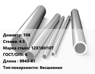 Труба нержавеющая 108х4.5 мм Сталь 12Х18Н10Т ГОСТ: 6 L=9940-81 бесшовная