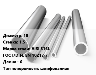 Труба нержавеющая 18х1.5 мм Сталь AISI 316L ГОСТ: EN 10217-7 L=6 шлифованная