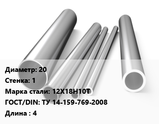 Труба нержавеющая 20х1 мм Сталь 12Х18Н10Т ГОСТ: ТУ 14-159-769-2008 L=4
