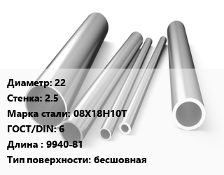 Труба нержавеющая 22х2.5 мм Сталь 08Х18Н10Т ГОСТ: 6 L=9940-81 бесшовная