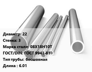 Труба нержавеющая 22х3 мм Сталь 08Х18Н10Т ГОСТ: ГОСТ 9941-81 бесшовная L=6.01