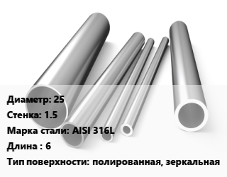 Труба нержавеющая 25х1.5 мм Сталь AISI 316L L=6 полированная, зеркальная