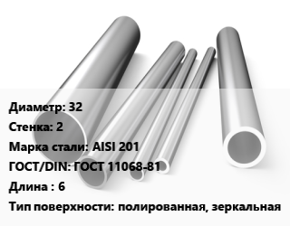 Труба нержавеющая 32х2 мм Сталь AISI 201 ГОСТ: ГОСТ 11068-81 L=6 полированная, зеркальная