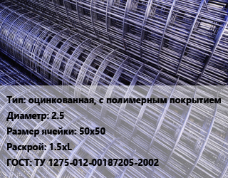 Сетка оцинкованная, с полимерным покрытием d=2.5 Ячейка: 50х50 Раскрой: 1.5хL ГОСТ: ТУ 1275-012-00187205-2002