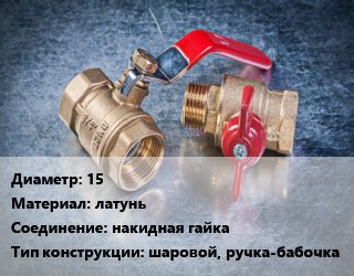 Кран металлический 15 латунь накидная гайка шаровой, ручка-бабочка