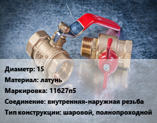 Кран металлический 15 латунь 11б27п5 внутренняя-наружная резьба шаровой, полнопроходной