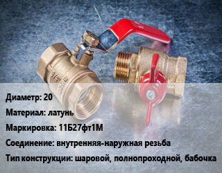 Кран металлический 20 латунь 11Б27фт1М внутренняя-наружная резьба шаровой, полнопроходной, бабочка