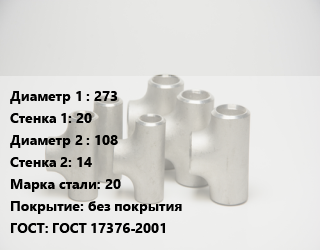 Тройник стальной 273х20 -108х14 Сталь: 20 без покрытия ГОСТ: ГОСТ 17376-2001